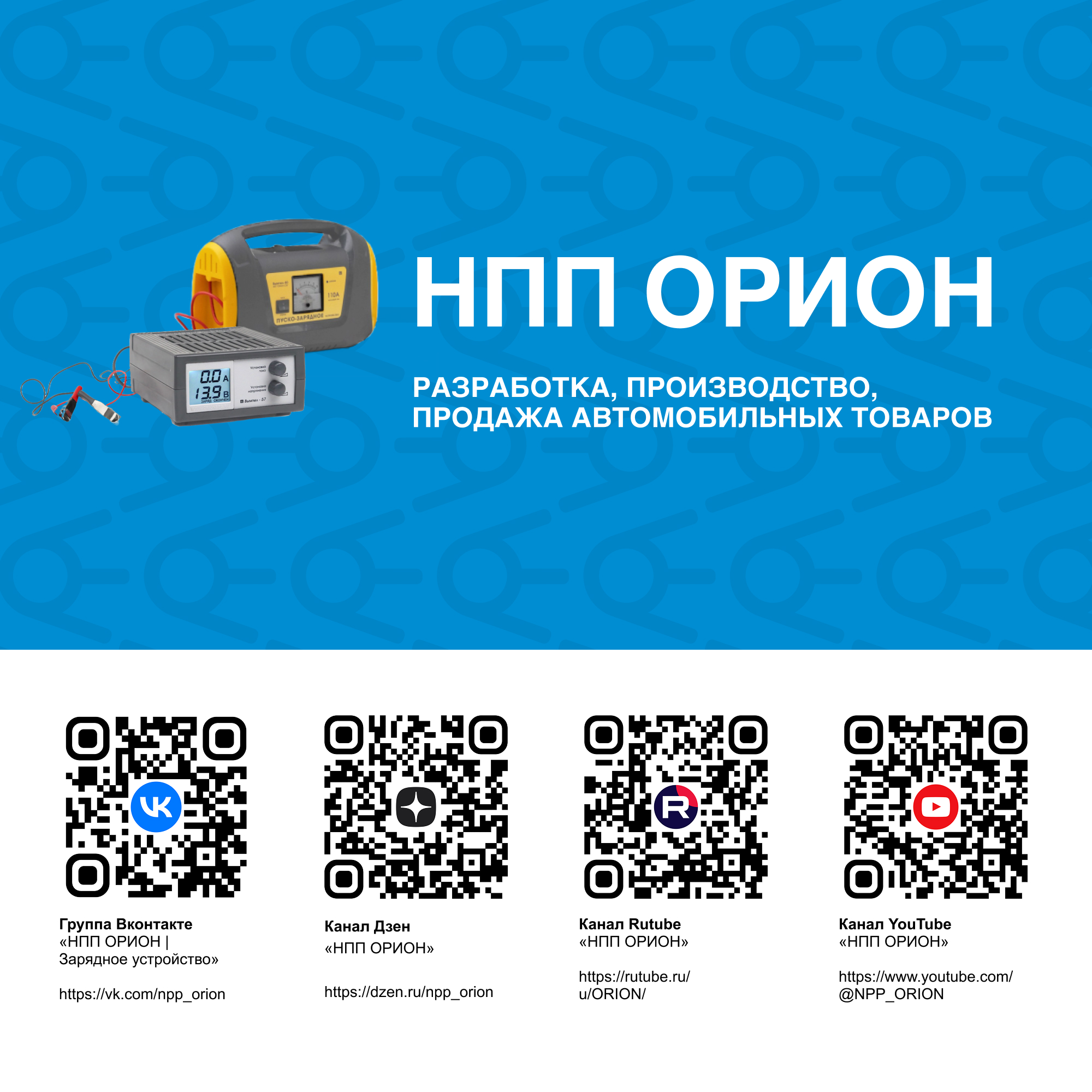 Компания OOO «НПП «Орион» основана в 1990 году в городе Санкт-Петербург и является одним из крупнейших производителей приборов и аксессуаров, зарядных устройств для аккумуляторов для автомобилей на территории России.